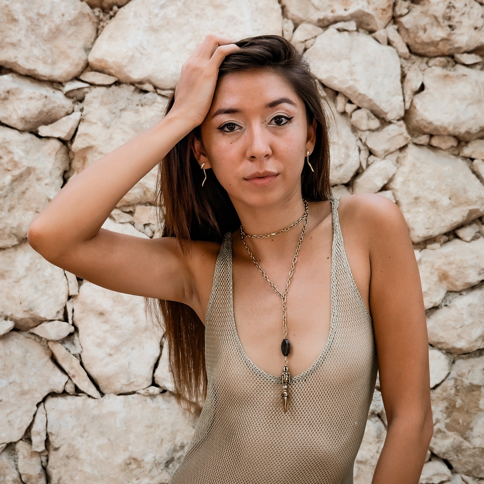 The Solar Plexus length can also be wrapped as a sexy choker, offering a bold and versatile styling option.